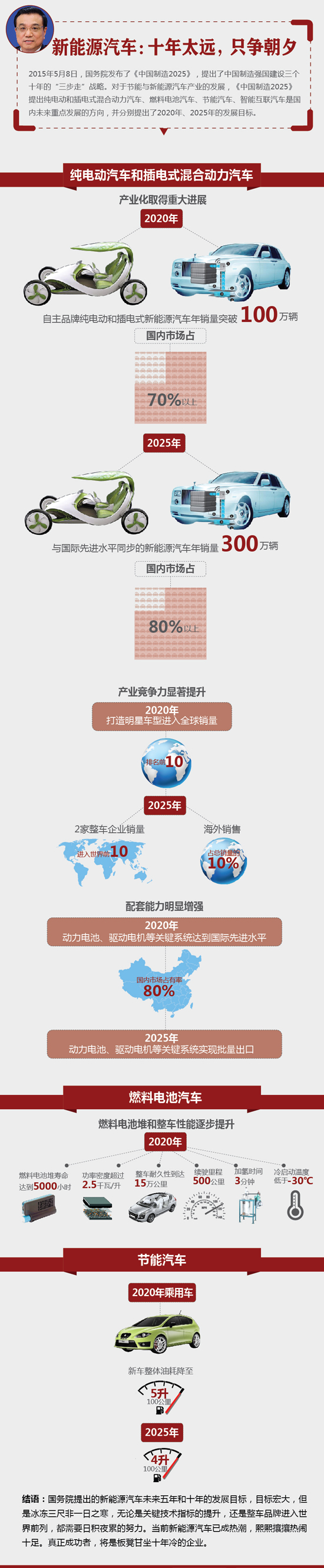 2015年5月8日,国务院发布了《中国制造2025》,提出了中国制造强国建设三个十年的“三步走”战略。对于节能与新能源汽车产业的发展,《中国制造2025》提出纯电动和插电式混合动力汽车、燃料电池汽车、节能汽车、智能互联汽车是国内未来重点发展的方向,并分别提出了2020年、2025年的发展目标。