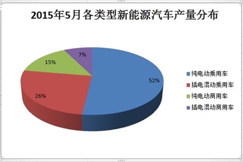 2015年1-5月,新能源汽车累计生产5.36万辆,同比增长近3倍。其中,纯电动乘用车生产2.58万辆,同比增长近3倍,插电式混合动力乘用车生产1.37万辆,同比增长3倍;纯电动商用车生产9248辆,同比增长近6倍,插电式混合动力商用车生产4761辆,同比增长58%。