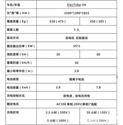 据记者调研,ElecTrike配备有高性能的小型电池,可用家用电源充电,充电一次最远可行驶约60km。但遗憾的是,为了延长续航里程,这款车并未配备空调。