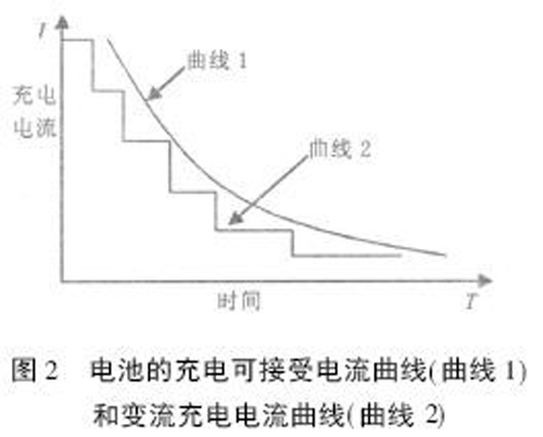 理想化的充电过程是充电电流始终逼近可接受的充电电流值。如图2中曲线2为变流充电电流曲线。图2中可以看出,在充电初期,充电电流较大,效率较高,克服了恒流/恒压充电阶段初期充电电流设置较小的缺点,随着充电继续,充电电流逐步减小,因此,可以将其原有的恒流充电阶段用分段恒流充电的过程来代替,达到提高充电效率。