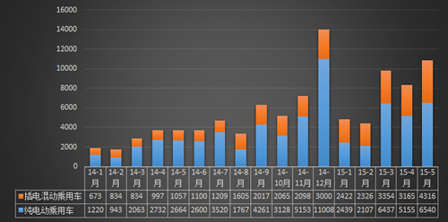 1、2014年-2015年5月新能源乘用车销售情况(单位:台)