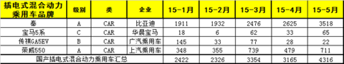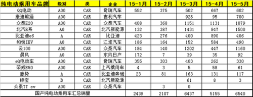 2、2015年前5月纯电动乘用车、插电式混动乘用车分品牌销售情况(单位:台)