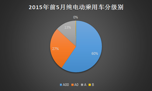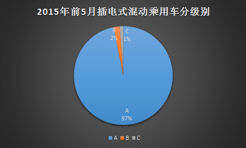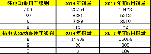3、2015年前5月纯电动乘用车、插电式混动乘用车分级别销量及占比(单位:台)