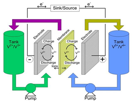 电解液储存在罐子中,泵带动电解液流入电极与隔膜之间进行发电。而充电过程相反。且电解液的体积决定了电池容量。