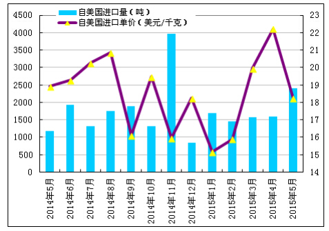 2015年5月份从美国进口多晶硅量大幅增加至2406吨,环比增幅为51.9%;5月份进口单价下滑至18.24美元/千克,环比降幅为17.9%。