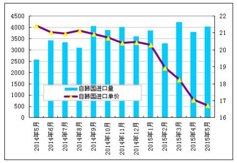 2015年5月份从韩国进口多晶硅量增加至4027吨,环比增幅为6.1%;5月份进口单价小幅下滑至16.74美元/千克,环比降幅为1.9%。