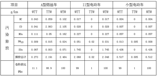 在我国2012年发电装机和能源结构情景下,选取三种不同耗电特性的电动汽车计算燃料生命周期评价结果,分别是9.8kWh/100km (I 型)、15kWh/100km (II 型)、20kWh/100km (III型)和两种不同油粍特性的燃油汽车,8L/100km (A型)(中国新发布的新生产汽车油耗标准)和9.48L/100km (B型)。参考实际车辆的情况,认为在汽车的驱动力和舒适性等性能比较上,III型电动汽车与B型燃油汽车相近,II型电动汽车与A型燃油汽车相近,I型电动汽车与1.0L排量以下的小型燃油汽车相近。查阅中国电网研究院资料,采用不同能源发电方式时的能耗和二氧化碳排放对比表如下: