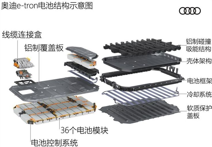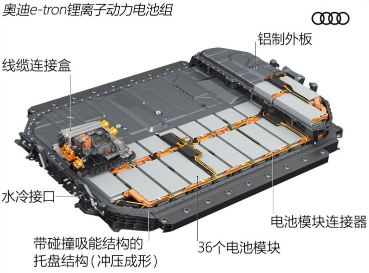 此外,奥迪为电池组准备了风冷与液冷两种不同的冷却方式,根据使用情况的不同,会采用不同的冷却循环。