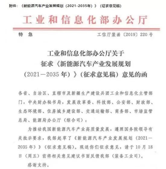 近日,标注“特急”字样的《新能源汽车产业发展规划(2021-2035年)》(征求意见稿)(以下简称《征求意见稿》)在业内流传,该文件在肯定了过去工作取得的成绩后,提出:“力争经过十五年持续努力,新能源汽车关键核心技术取得重大突破、融合发展协调高效、产业生态健全完善,纯电动乘用车成为主流,燃料电池商用车实现规模化应用,高度自动驾驶智能网联汽车趋于普及,我国进入世界汽车强国行列。”