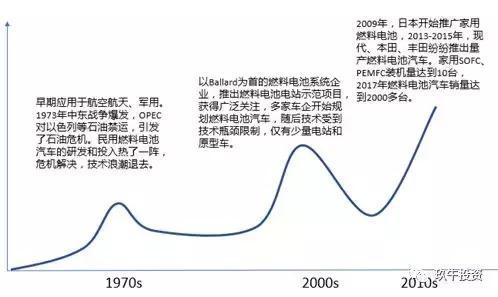 早在上世纪60-70年代,氢燃料电池就已经应用到航空和军工领域,由于石油危机爆发,民用氢燃料电池受到一段时间热捧,但终因为技术不成熟,难以商业化而退潮。在2000年前后以巴拉德为代表的燃料电池厂商,开始推出燃料电池电站,在非洲、北美等多地运用良好,这一阶段受到了市场热捧,大量资本涌入,巴拉德股价也飞涨,但由于成本高,大规模商业化仍然存在较大问题。就在此时,基于国家能源战略角度出发,日本提出了氢能社会,逐步加大了在燃料电池领域的研发,在2009年,开始推广家用燃料电池,此后燃料电池在日本国内燃料电池商业化迈上了快速发展阶段,随着2013-2015年量产氢燃料电池车型的推出,氢燃料电池被推到风口浪尖。